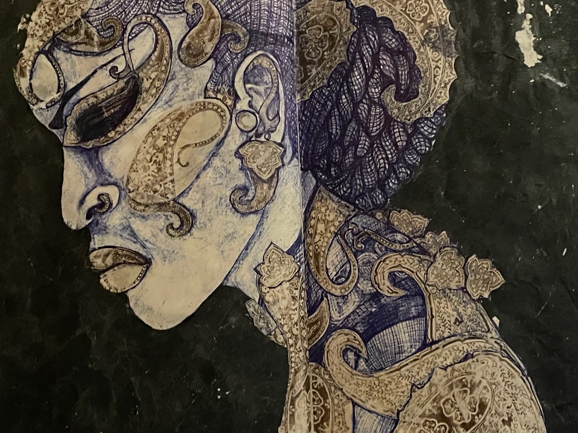 Hennes blick är sluten, men ändå vaken — som om hon lyssnar inåt, bär en hemlighet hon inte tänker dela i första taget. De paisley-liknande formerna ringlar sig som tankar eller minnen över hennes ansikte och hals. Håret, vävt som en berättelse i sig. Hon känns som en prästinna av stillhet och styrka