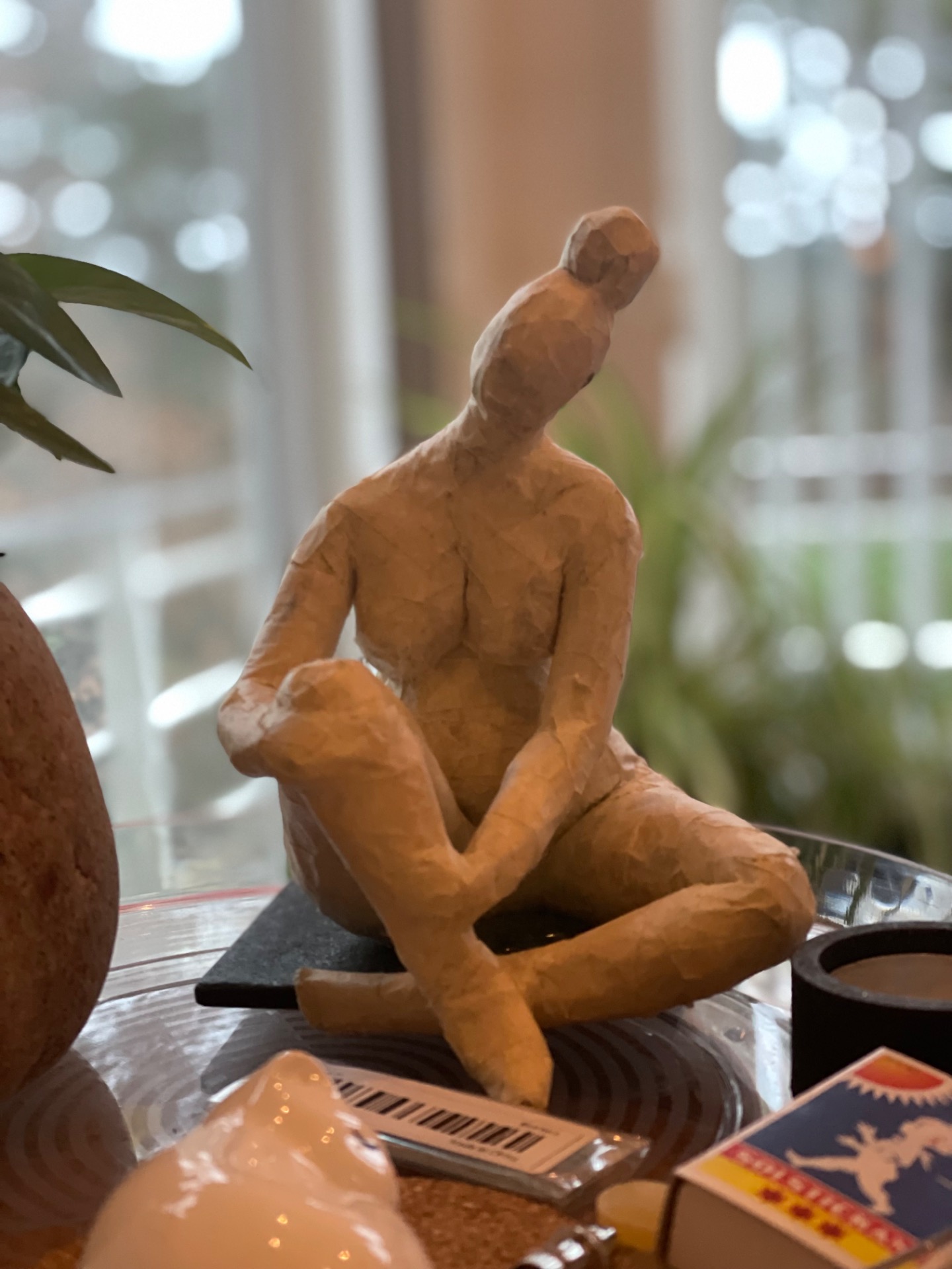 Jag sitter här i stillhet, med tyngden av kroppen mot hyllan och blicken vänd inåt. Jag bär på både vila och väntan, och i mitt tysta lutande finns ett samtal som inte behöver ord. Kom, sätt dig hos mig – dela tystnaden med mig – låt tiden vara en stund.