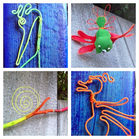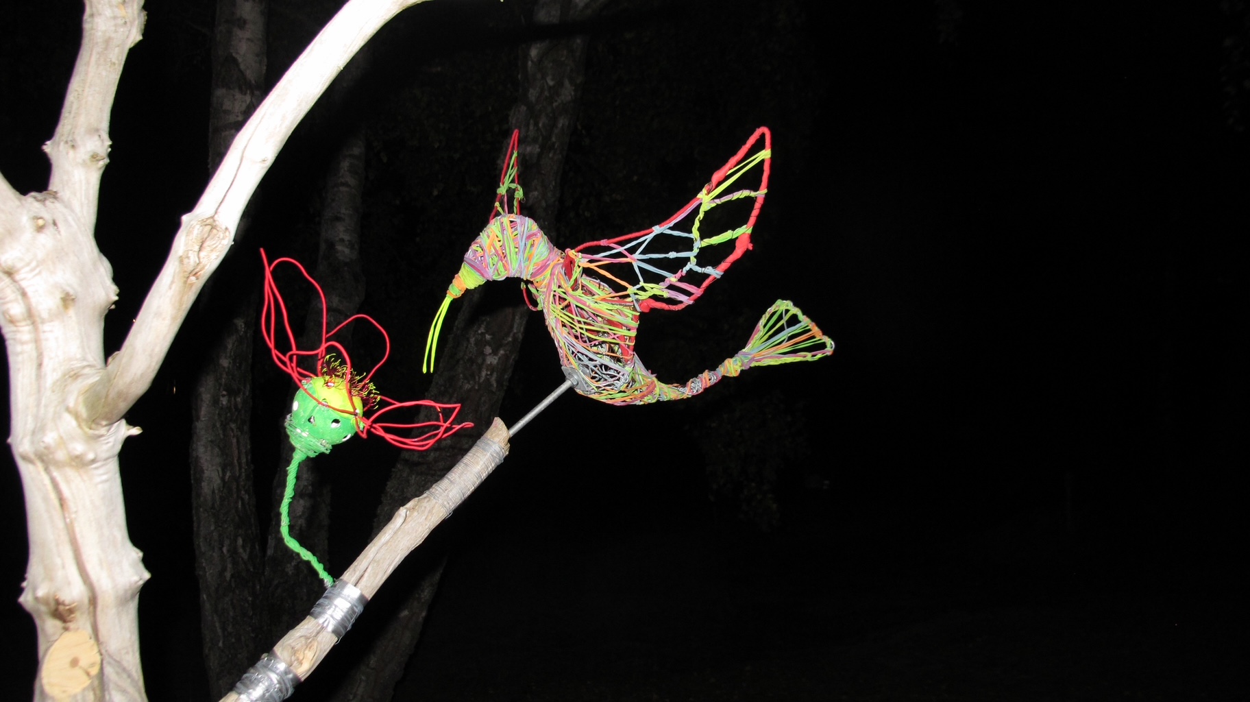Fåglar som jag gjorde jag av ståltråd, broderitråd, strumpbyxor, pinnar och var målade i neonfärger.