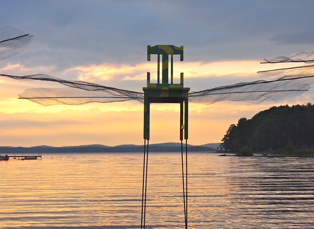 Installation av Leon Lewandowski, en av hans tre magiska stolar, "Trollsländor" i Mjörns vatten vid Gallvik