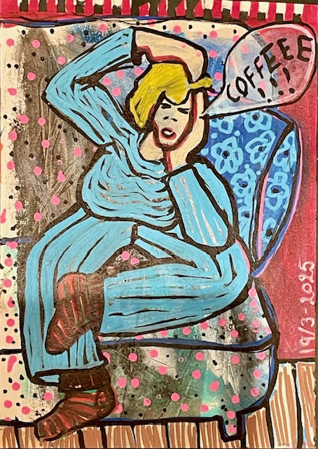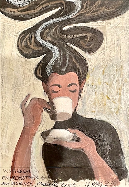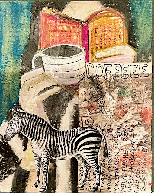 Bilden fick ett eget liv, den ville ha en zebra, så jag klippte ur ett å satte dit en! Bilden för mig, visar en kvinna, gömd i sina egna ritualer – en bok, en kopp kaffe, händer som håller fast i ögonblicket. Tystnad, koncentration, vila. En bild om de små rummen vi skapar för oss själva – där man får andas, läsa, drömma.