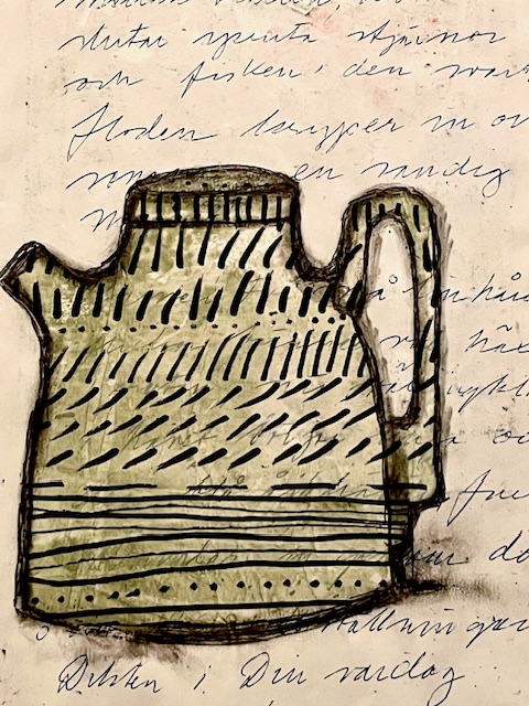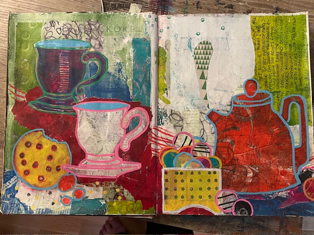 Här har jag klippt ut formen av tea-koppar från mitt lager av handtryckta rispapper och klistrat in i ett collage