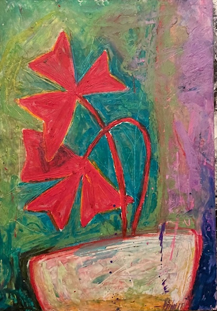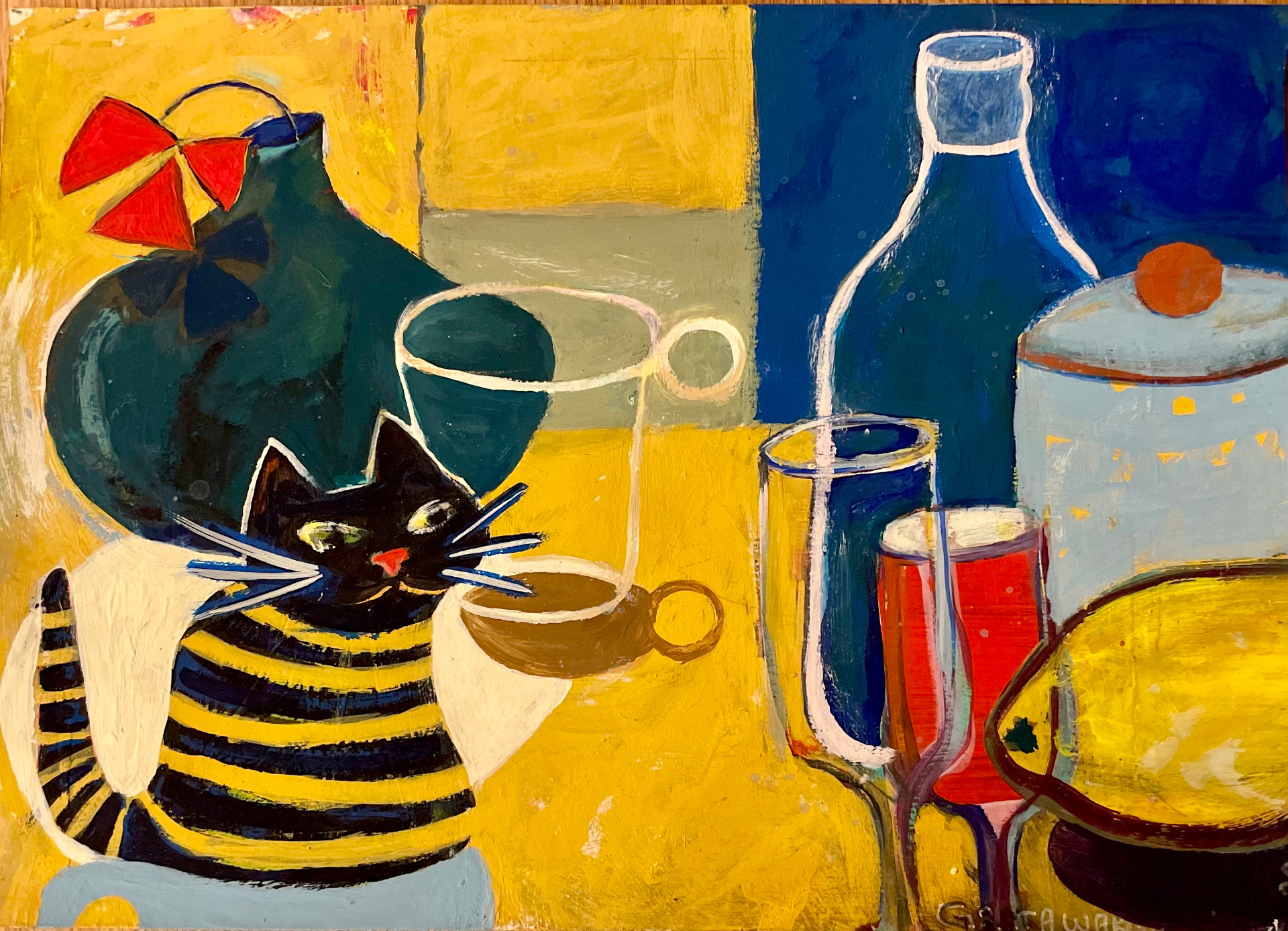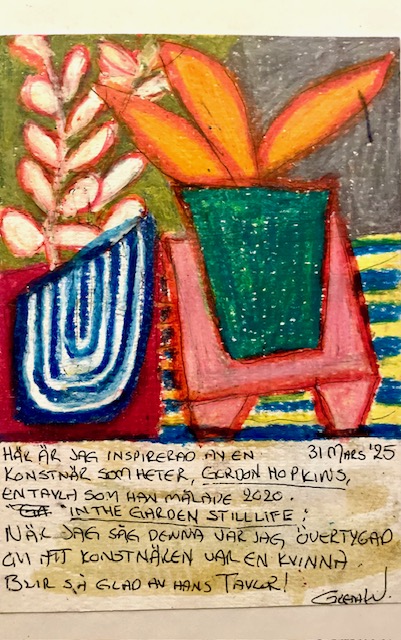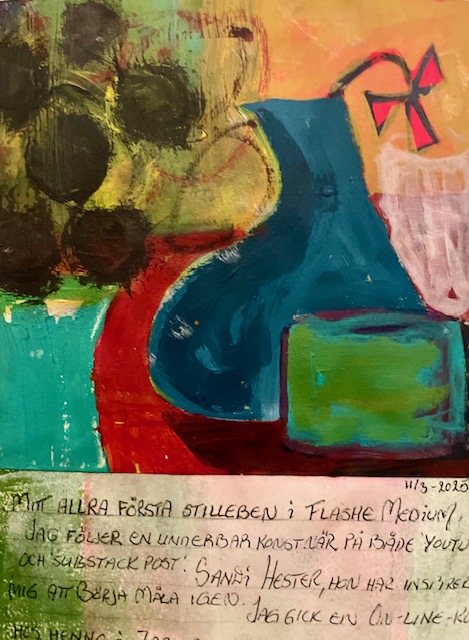 En stilleben utmaning, som jag gjorde via Sandie Hester's kurs på Youtube - man fick 5minuter att samla ihop olika objekt hemma, det skulle vara själva formen som tilltalade en - sen skulle man måla - tror man fick 30minuter på sig - det tog lite längre tid för mig. Blandteknik: Flashefärger och Poscapennor