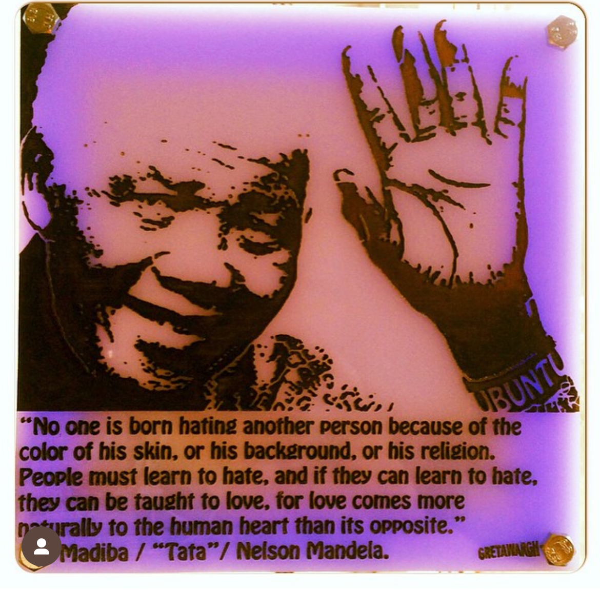 Homage till Nelson Mandela. Plexi med belysning, monterad i ryggen på UBUNTU- stolen.
