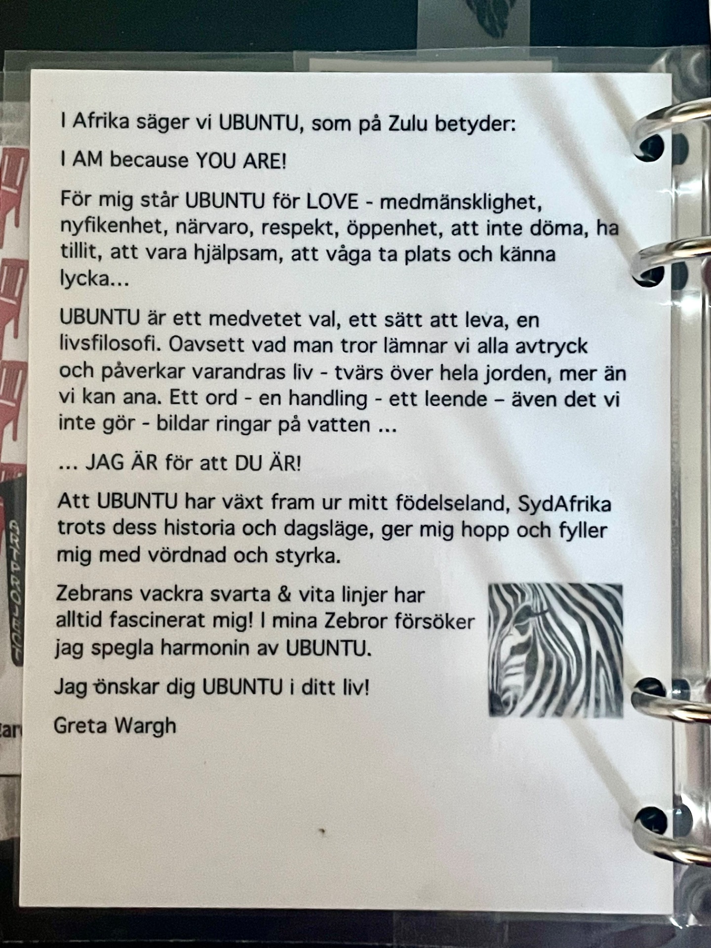 Zebra Harmony. Zebrorna i min utställning symboliserar mitt sätt att se UBUNTU - att vi omedvetet påverkar varandra mer än vi tror. Jag Är för att Du är - Jag Är för att Vi Är! Även i de små gesterna, exempelvis att ge någon ett leende utan att själv förvänta sig ett leende tillbaka - att förstå att en person kanske inte kan besvara den, men kan behöva en - leendet kommer tillbaka till någon annan, en annan gång ...